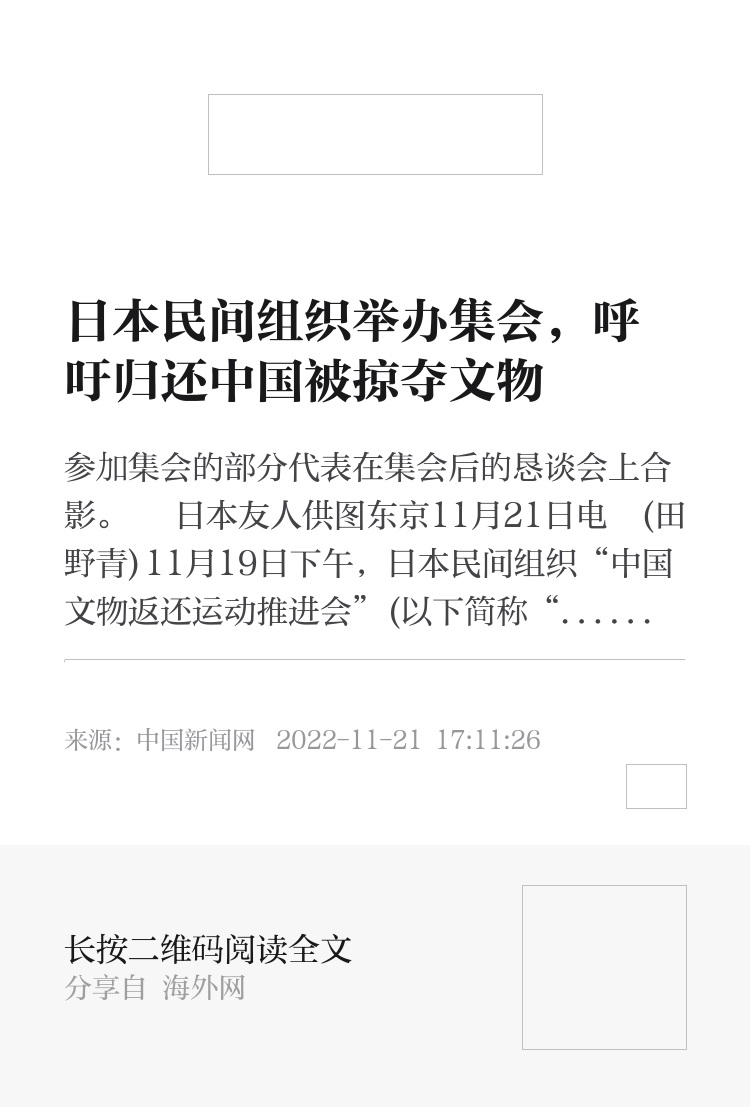 中新网东京11月21日电 (田野青)11月19日下午,日本民间组织“中国文物返还运动推进会”(以下简称“推进会”)在东京举行了“以中日草根运动,推动实现文物返还”的集会,再次呼吁日本政府归还战时中国被掠夺中国文物。中国三位民间代表线上参会并发言声援。