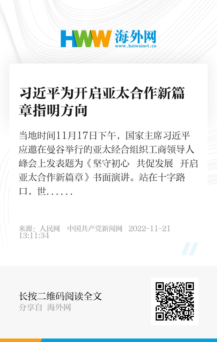 当地时间11月17日下午,国家主席习近平应邀在曼谷举行的亚太经合组织工商领导人峰会上发表题为《坚守初心 共促发展 开启亚太合作新篇章》书面演讲。