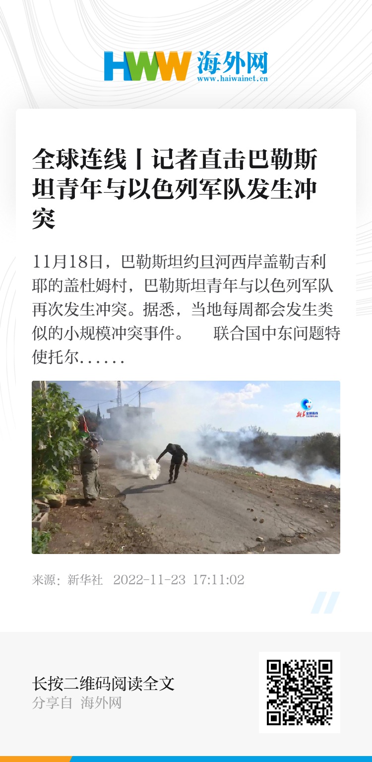 11月18日,巴勒斯坦约旦河西岸盖勒吉利耶的盖杜姆村,巴勒斯坦青年与以色列军队再次发生冲突。据悉,当地每周都会发生类似的小规模冲突事件。