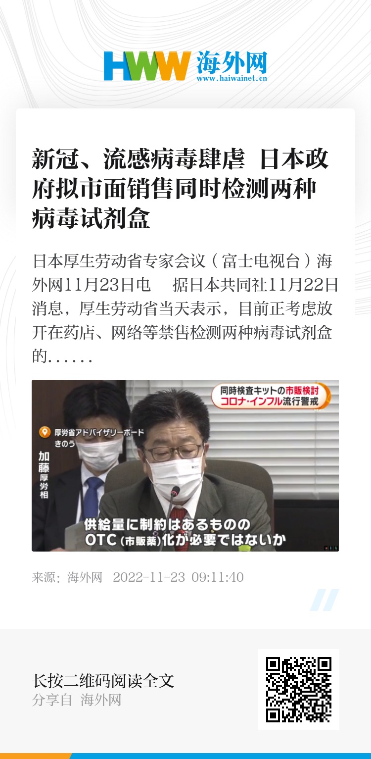海外网11月23日电 据日本共同社11月22日消息,厚生劳动省当天表示,目前正考虑放开在药店、网络等禁售检测两种病毒试剂盒的规定。这种检测试剂盒可同时检测出人们是否感染新冠病毒和流感病毒。