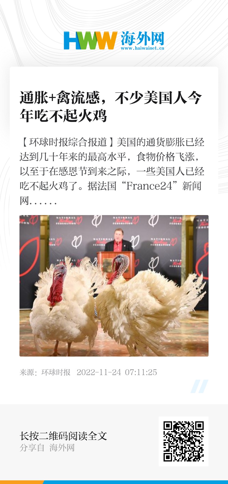 【环球时报综合报道】美国的通货膨胀已经达到几十年来的最高水平,食物价格飞涨,以至于在感恩节到来之际,一些美国人已经吃不起火鸡了。