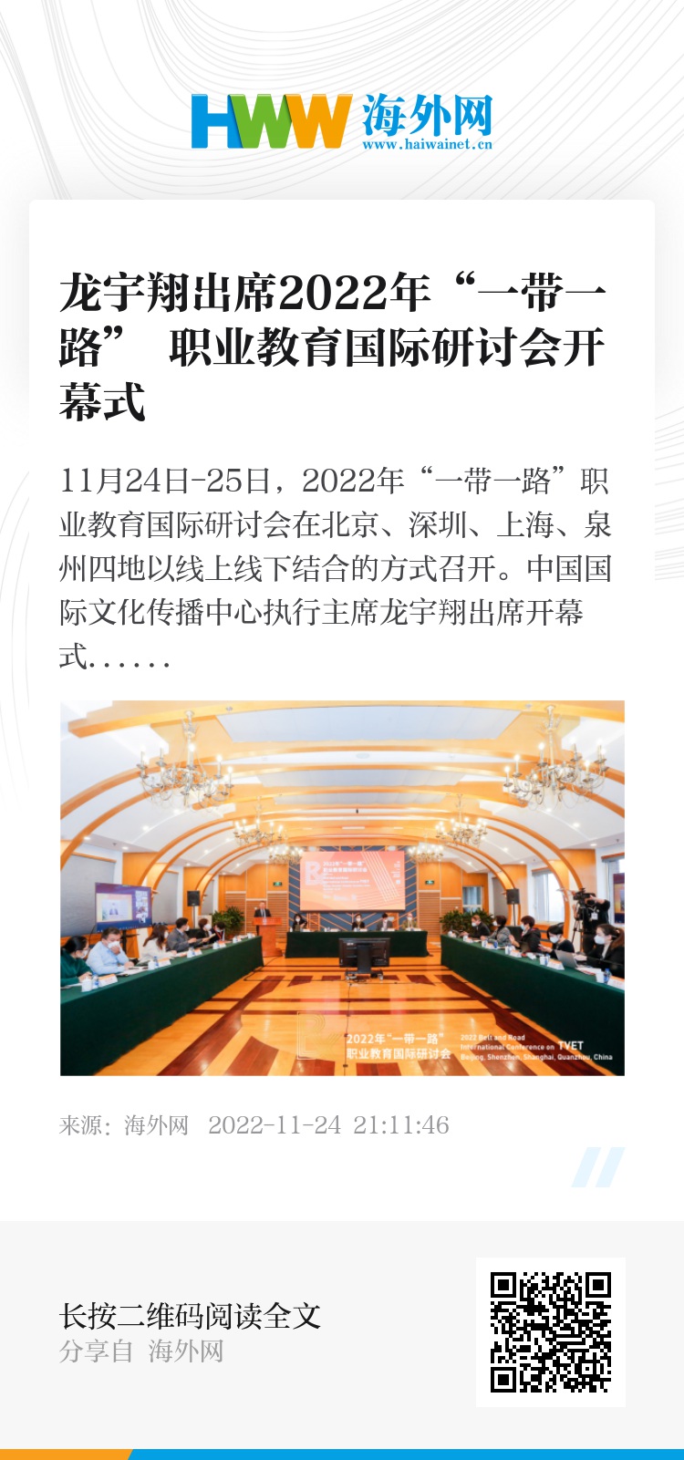 11月24日-25日,2022年“一带一路”职业教育国际研讨会在北京、深圳、上海、泉州四地以线上线下结合的方式召开。中国国际文化传播中心执行主席龙宇翔出席开幕式,并视频致辞。