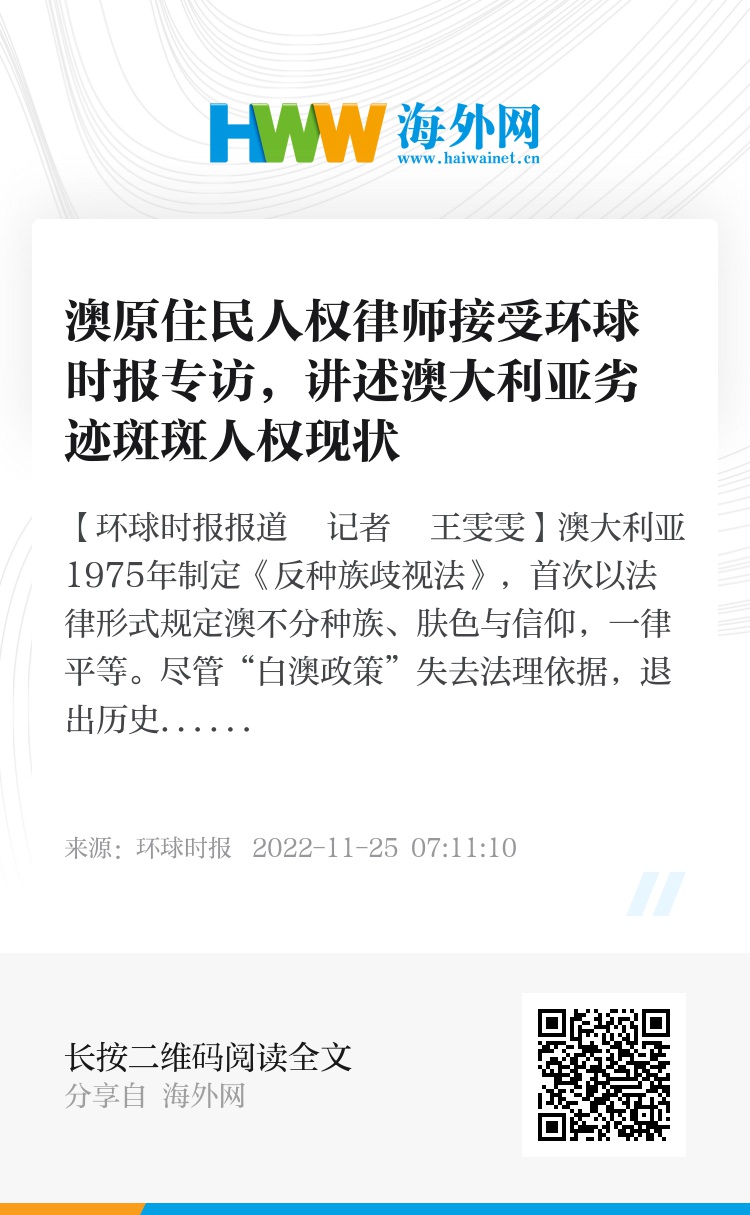 【环球时报报道 记者 王雯雯】澳大利亚1975年制定《反种族歧视法》,首次以法律形式规定澳不分种族、肤色与信仰,一律平等。尽管“白澳政策”失去法理依据,退出历史舞台,但该国对原住民的种族歧视与不公正对待并未消除。上个月,一起原住民少年在放学路上被白人男子袭击致死的案件,引起原住民的强烈不满,澳官方也表示这是一起“清楚的由种族歧视引发的谋杀”。澳大利亚人权律师、学者汉娜·麦格莱德是来自“努伽”(Noongar)部落的原住民后代。她长期专注于为原住民伸张正义,特别是为原住民妇女和儿童不再遭受种族歧视和受到侵犯提供法律帮助,还告赢过嘲讽“原住民是地球上最原始种族”的联邦参议员。汉娜近日在接受《环球时报》记者专访时,讲述了澳大利亚劣迹斑斑的人权现状。