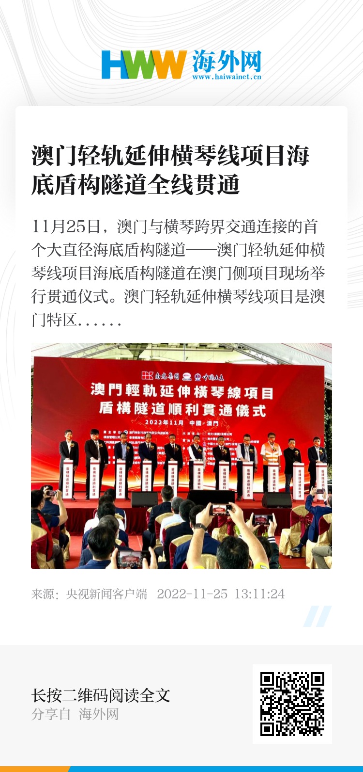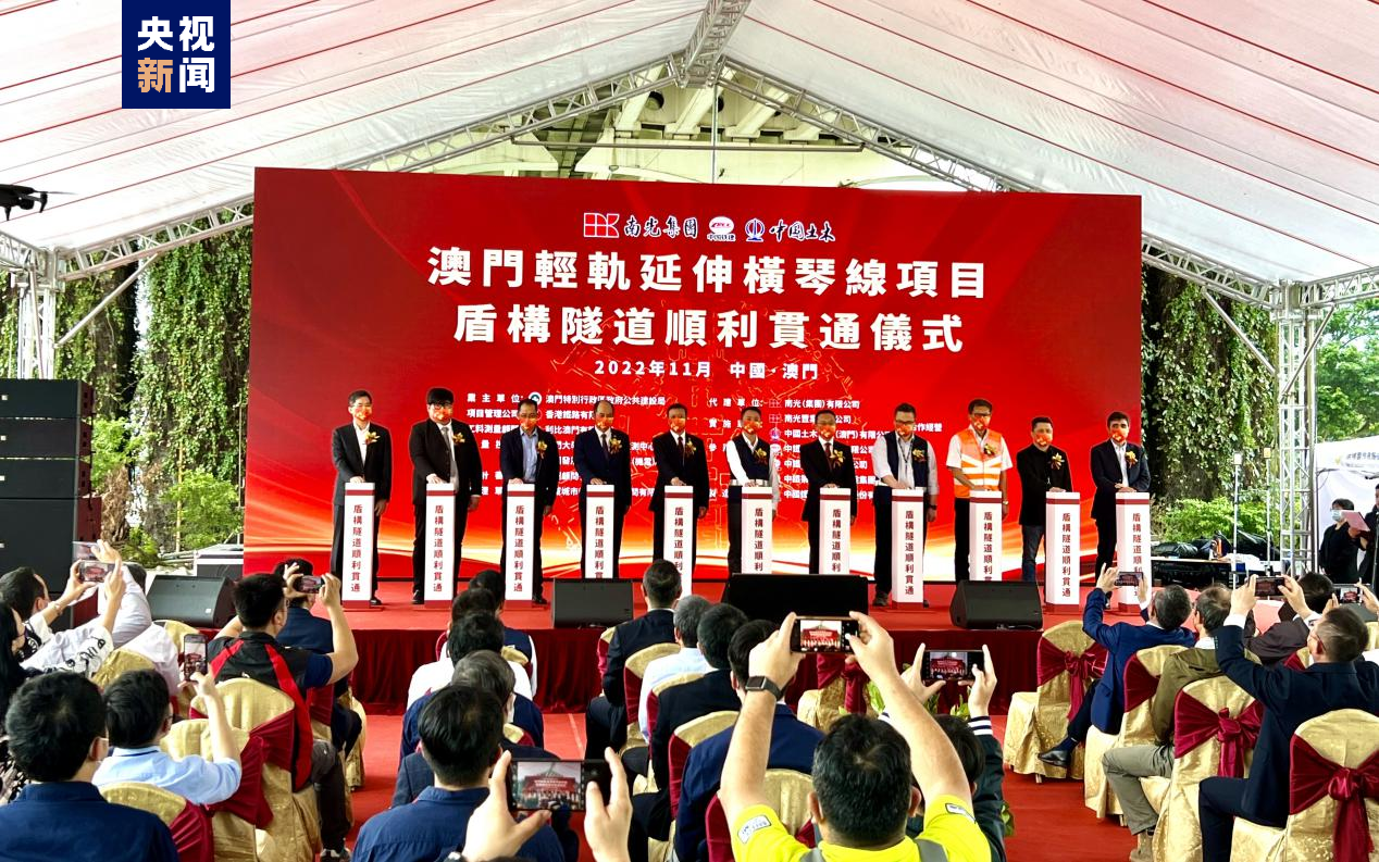 11月25日,澳门与横琴跨界交通连接的首个大直径海底盾构隧道——澳门轻轨延伸横琴线项目海底盾构隧道在澳门侧项目现场举行贯通仪式。