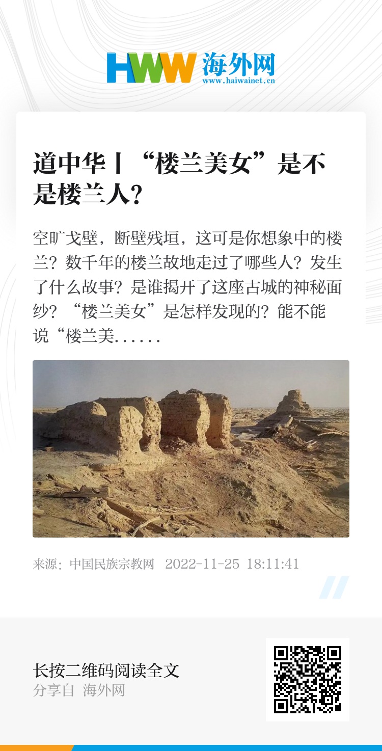 前面提到,“楼兰美女”的年代,较之楼兰国或城都要早出许多,时代不同,所以不能泛泛地说“楼兰美女”就是楼兰人。