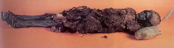 铁板河墓葬出土干尸。(图片来源:新疆维吾尔自治区文物局主编的《新疆文物古迹大观》)