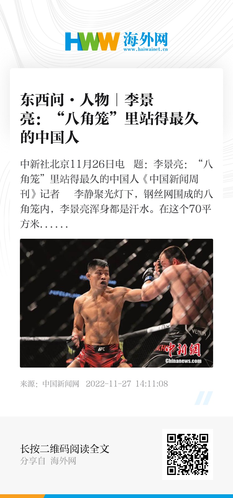 中新社北京11月26日电 题:李景亮:“八角笼”里站得最久的中国人