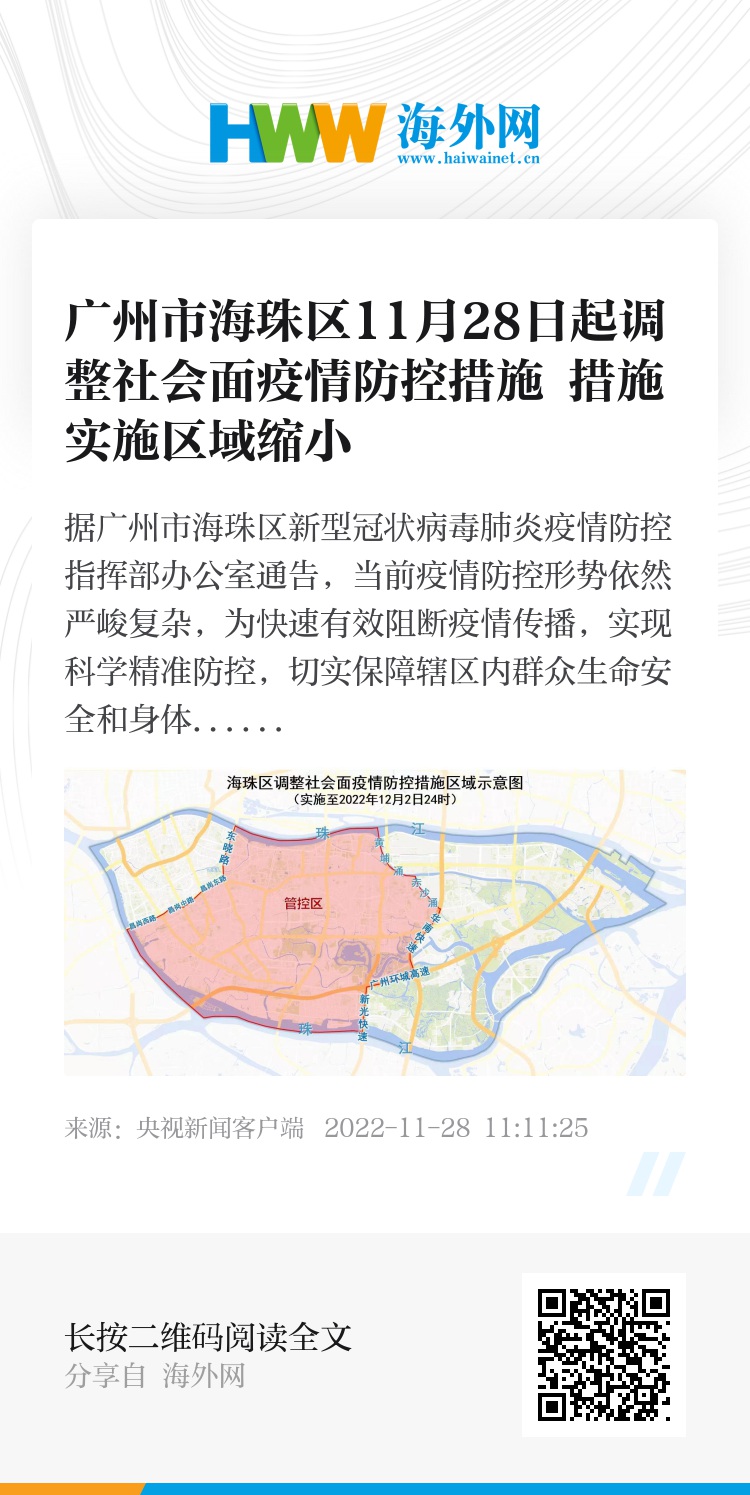 据广州市海珠区新型冠状病毒肺炎疫情防控指挥部办公室通告,当前疫情防控形势依然严峻复杂,为快速有效阻断疫情传播,实现科学精准防控,切实保障辖区内群众生命安全和身体健康,经综合研判,2022年11月28日0时起优化调整社会面疫情防控措施。现将相关事项通告如下: