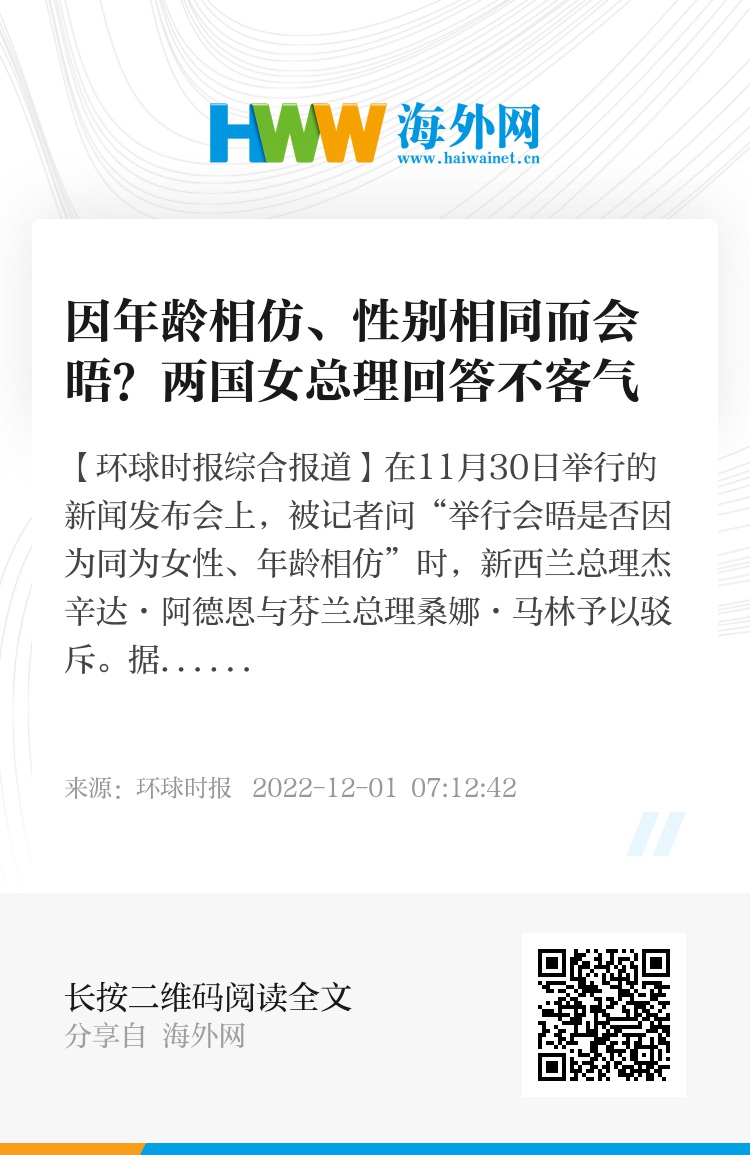 【环球时报综合报道】在11月30日举行的新闻发布会上,被记者问“举行会晤是否因为同为女性、年龄相仿”时,新西兰总理杰辛达·阿德恩与芬兰总理桑娜·马林予以驳斥。据英国《独立报》11月30日报道,阿德恩与马林首次会晤后,在新西兰奥克兰政府大楼当日上午举行的联合新闻发布会上,二人对媒体提出的乌克兰、阿富汗局势等问题进行解答。然而一段“小插曲”却让场面一度陷入尴尬——一位记者发问:“你们两位之所以会晤,是因为你们年纪差不多而且在性别、从政经历等方面也有很多共同点吗?”面对这名记者涉及到私人层面的提问,阿德恩回应称:“我想知道,在奥巴马和新西兰前总理会晤的时候,是否有人问过同样的问题?”马林则表示:“我们之所以会晤,是因为我们的身份都是国家总理。”