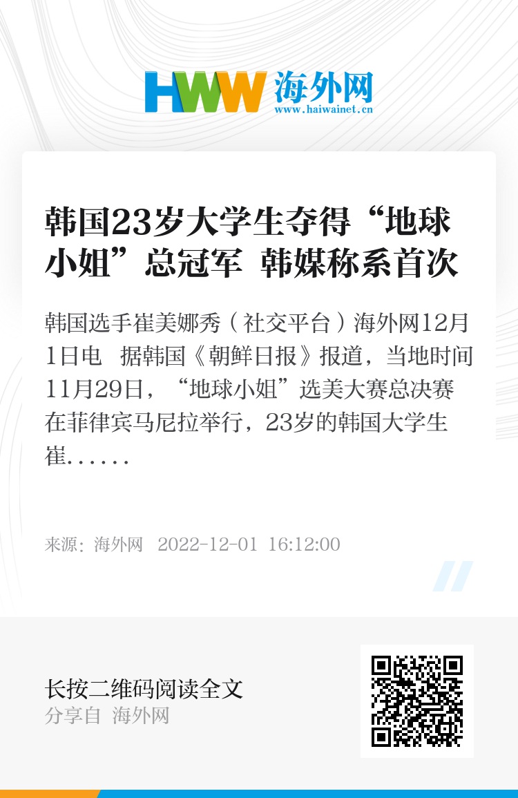 海外网12月1日电 据韩国《朝鲜日报》报道,当地时间11月29日,“地球小姐”选美大赛总决赛在菲律宾马尼拉举行,23岁的韩国大学生崔美娜秀(音译)夺冠。这是韩国选手首次在世界四大选美中夺冠。