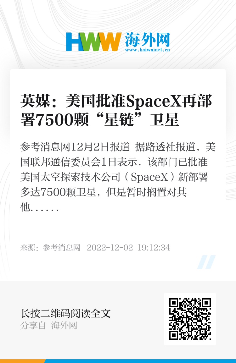 参考消息网12月2日报道 据路透社报道,美国联邦通信委员会1日表示,该部门已批准美国太空探索技术公司(SpaceX)新部署多达7500颗卫星,但是暂时搁置对其他一些申请的审议工作。