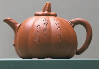 此次展览中的东陵南瓜壶是无锡宜兴紫砂壶珍品,由素有“花器圣手”之称的清代名匠陈鸣远制作,现藏于南京博物院。此壶以瓜为壶体,瓜蒂为壶盖,瓜蔓为壶把,瓜叶盘旋成壶嘴,造型生动自然,独具匠心。壶身题词“仿得东陵式 盛来雪乳香 鸣远”,并压铃阳文篆体“陈鸣远”方印。