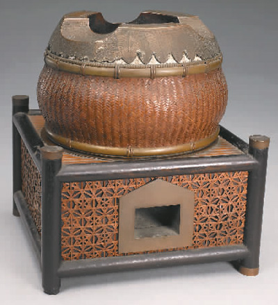 此次展览中展出了一件原藏于紫禁城重华宫内的竹茶炉。此炉分为上下两部分,上圆下方,上为炭炉,内以泥作壁,外包竹丝编织;下为方形火灶,开长方形风口,边框以竹作架,并以宽细竹丝编织六角篾纹包裹。铫座为铜制并铸有纹饰,圆、方炉上下皆有红铜护圈,做工精巧细致。