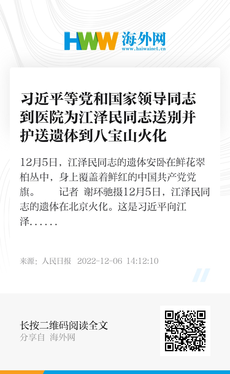 新华社北京12月5日电 我党我军我国各族人民公认的享有崇高威望的卓越领导人,伟大的马克思主义者,伟大的无产阶级革命家、政治家、军事家、外交家,久经考验的共产主义战士,中国特色社会主义伟大事业的杰出领导者,党的第三代中央领导集体的核心,“三个代表”重要思想的主要创立者江泽民同志的遗体5日在北京火化。习近平、李克强、栗战书、汪洋、李强、赵乐际、王沪宁、韩正、蔡奇、丁薛祥、李希、王岐山等到中国人民解放军总医院为江泽民同志送别,并护送江泽民同志的遗体到八宝山革命公墓火化。胡锦涛也前往医院为江泽民同志送别。