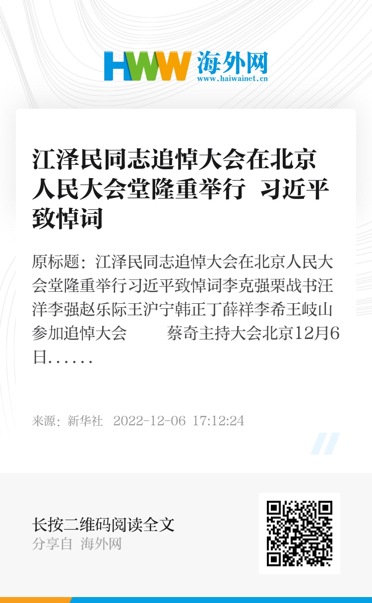 新华社北京12月6日电 我党我军我国各族人民公认的享有崇高威望的卓越领导人,伟大的马克思主义者,伟大的无产阶级革命家、政治家、军事家、外交家,久经考验的共产主义战士,中国特色社会主义伟大事业的杰出领导者,党的第三代中央领导集体的核心,“三个代表”重要思想的主要创立者江泽民同志与世长辞,在全国各族人民心中引起无限悲痛。6日上午,中共中央、全国人大常委会、国务院、全国政协、中央军委在人民大会堂隆重举行江泽民同志追悼大会。习近平、李克强、栗战书、汪洋、李强、赵乐际、王沪宁、韩正、蔡奇、丁薛祥、李希、王岐山等参加大会。大会通过全国广播电视、新闻网站现场直播。举国上下,各族人民沉痛悼念江泽民同志。