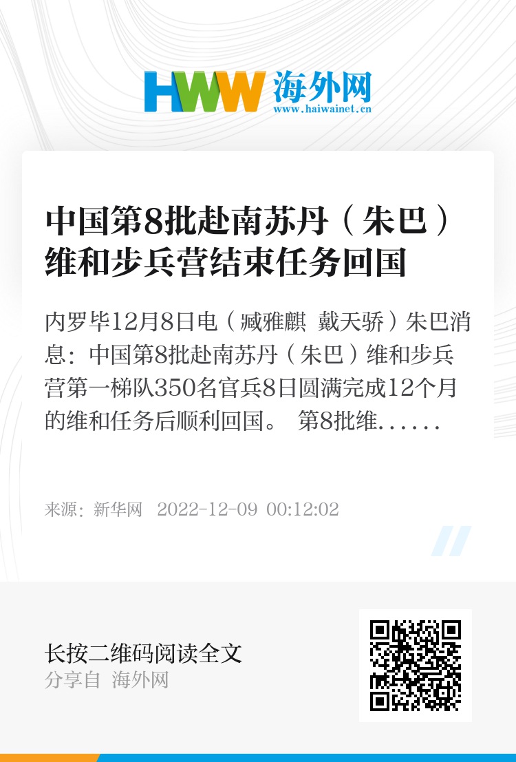 新华社内罗毕12月8日电(臧雅麒 戴天骄)朱巴消息:中国第8批赴南苏丹(朱巴)维和步兵营第一梯队350名官兵8日圆满完成12个月的维和任务后顺利回国。