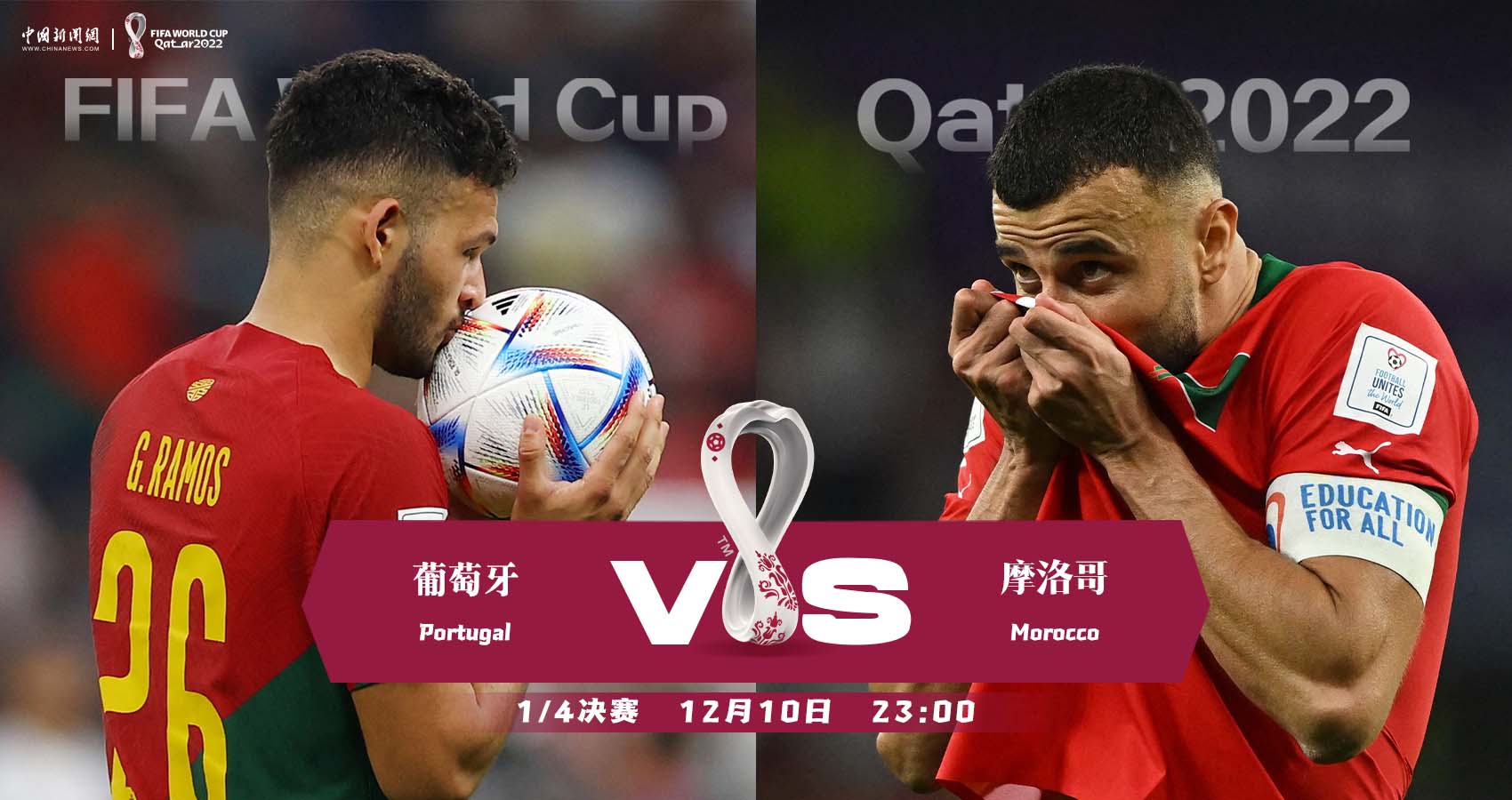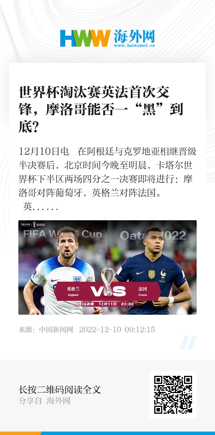 中新网12月10日电 在阿根廷与克罗地亚相继晋级半决赛后,北京时间今晚至明晨,卡塔尔世界杯下半区两场四分之一决赛即将进行:摩洛哥对阵葡萄牙,英格兰对阵法国。