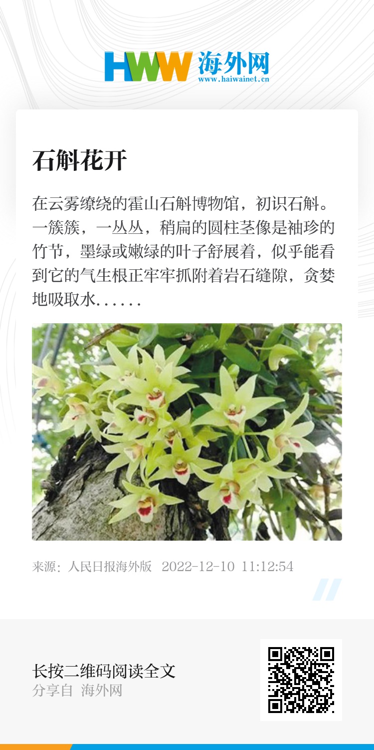 在云雾缭绕的霍山石斛博物馆,初识石斛。一簇簇,一丛丛,稍扁的圆柱茎像是袖珍的竹节,墨绿或嫩绿的叶子舒展着,似乎能看到它的气生根正牢牢抓附着岩石缝隙,贪婪地吸取水汽和养分。