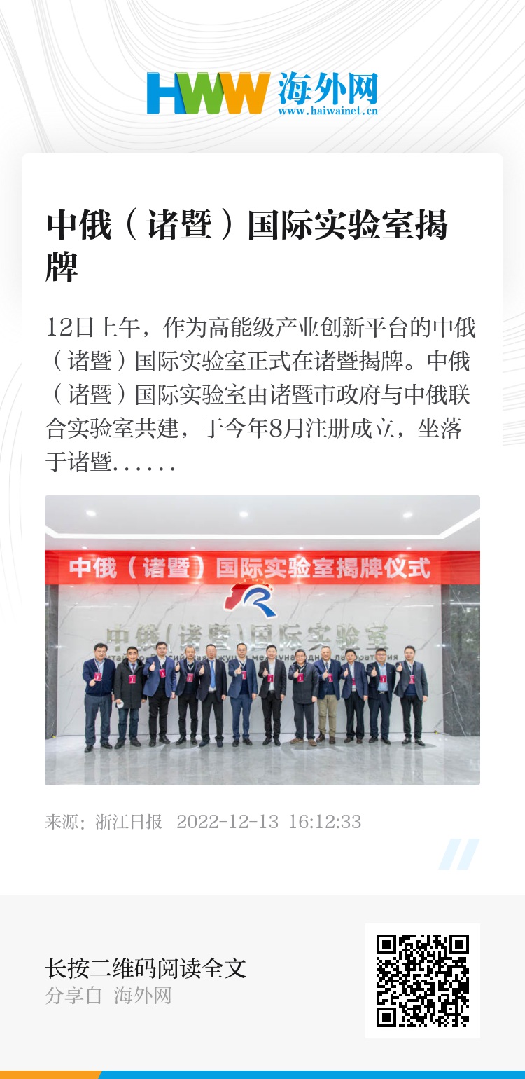 12日上午,作为高能级产业创新平台的中俄(诸暨)国际实验室正式在诸暨揭牌。