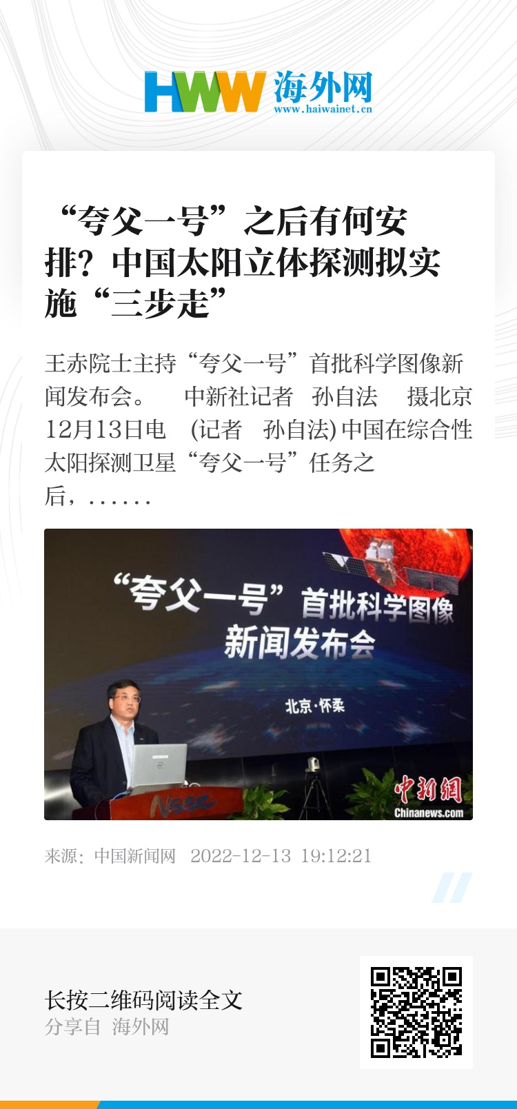 “夸父一号”首批科学图像新闻发布会当天在北京怀柔科学城举行,王赤院士主持发布会,他在回答关于“夸父一号”之后中国空间科学领域的太阳探测任务有何部署时作上述表示。