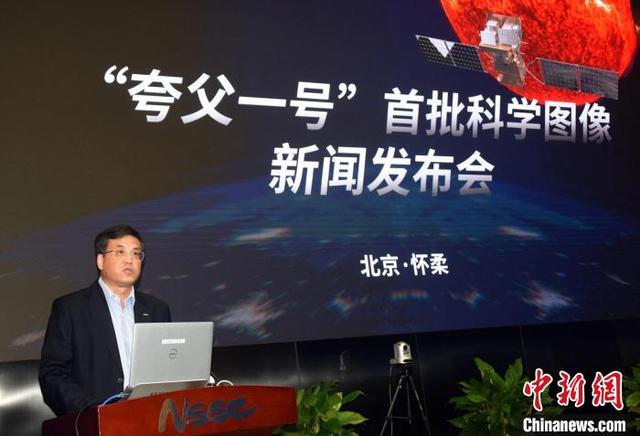 王赤院士主持“夸父一号”首批科学图像新闻发布会。 中新社记者 孙自法 摄