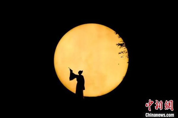 演员在人工月亮前吟诵唐诗宋词。(中新网发 杨华峰 摄)