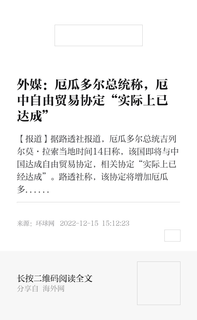 路透社报道称,中国与拉丁美洲企业家于当地时间12月14日在厄瓜多尔西南部港口城市瓜亚基尔举行了相关会议。拉索当天在会议上谈及厄中自贸协定工作时说,“在不到10个月的时间里进行了高效谈判,我可以确认该协定实际上已经达成”。他还补充说,“我们工业部门的利益得到了考虑,制造业领域的就业得到了保障”。