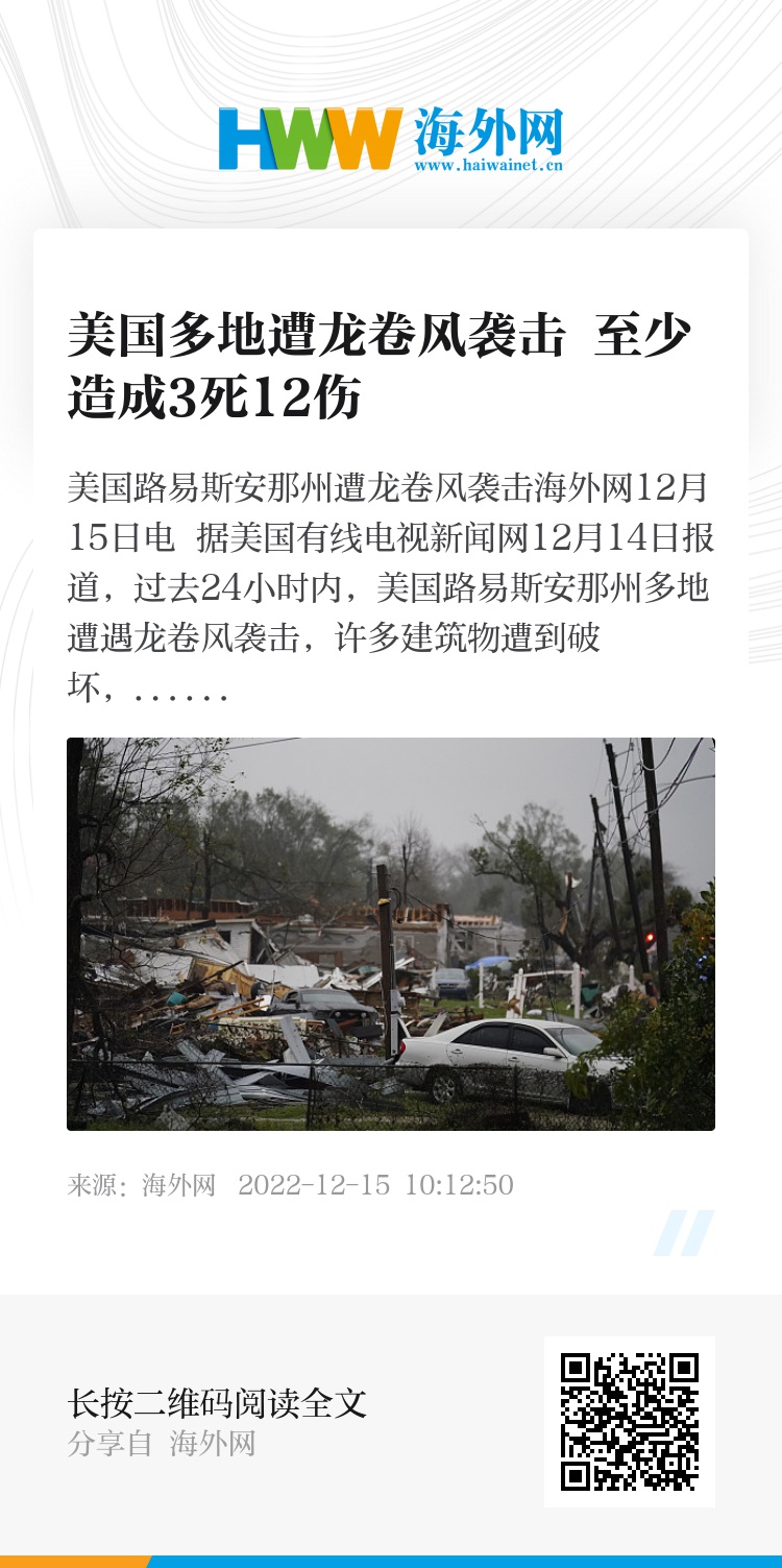 海外网12月15日电 据美国有线电视新闻网12月14日报道,过去24小时内,美国路易斯安那州多地遭遇龙卷风袭击,许多建筑物遭到破坏,造成至少3人死亡12人受伤。