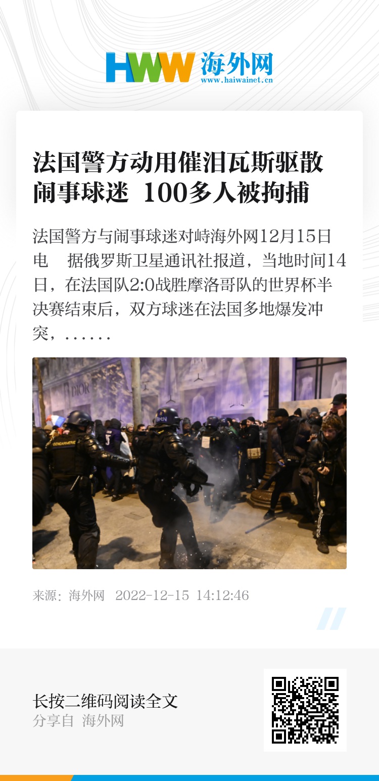 海外网12月15日电 据俄罗斯卫星通讯社报道,当地时间14日,在法国队2:0战胜摩洛哥队的世界杯半决赛结束后,双方球迷在法国多地爆发冲突,警方目前已拘捕100多人。