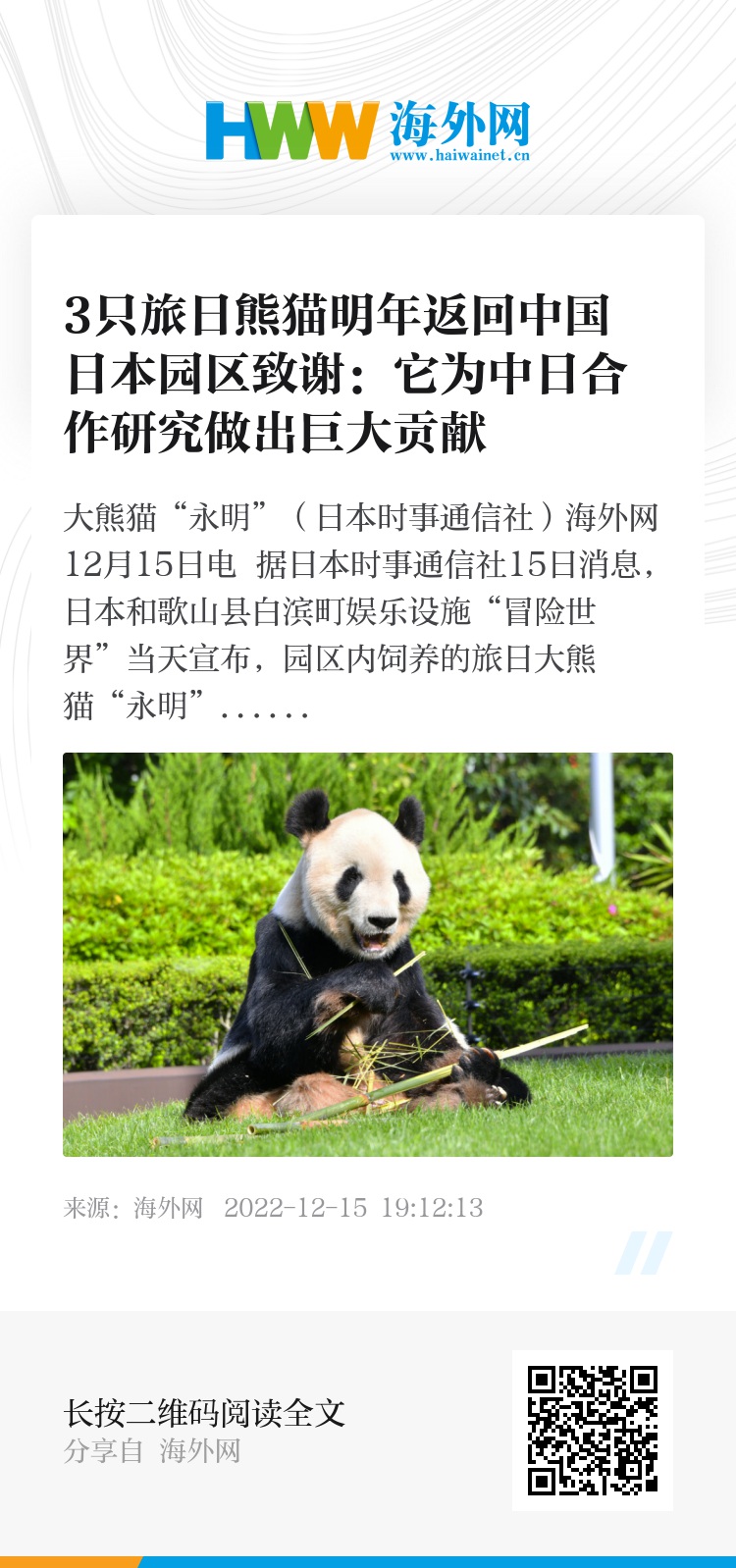 海外网12月15日电 据日本时事通信社15日消息,日本和歌山县白滨町娱乐设施“冒险世界”当天宣布,园区内饲养的旅日大熊猫“永明”,以及它的双胞胎女儿“樱滨”和“桃滨”定于2023年2月回到中国成都。