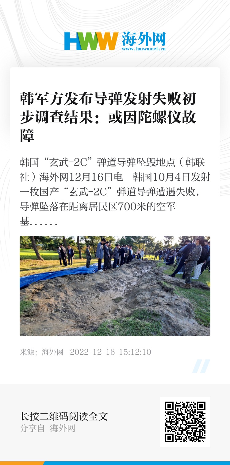 海外网12月16日电 韩国10月4日发射一枚国产“玄武-2C”弹道导弹遭遇失败,导弹坠落在距离居民区700米的空军基地内。据韩联社报道,韩军方调查人员12月16日公布初步调查结果,认为事故或因陀螺仪故障导致。
