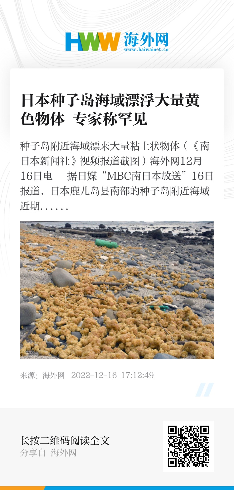 海外网12月16日电 据日媒“MBC南日本放送”16日报道,日本鹿儿岛县南部的种子岛附近海域近期漂来大量粘土状物体,专家称极其罕见。