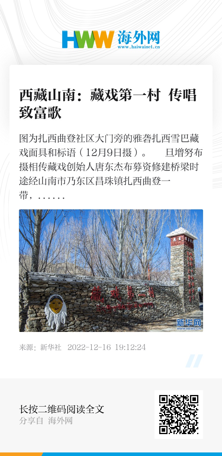 图为扎西曲登社区大门旁的雅砻扎西雪巴藏戏面具和标语(12月9日摄)。新华网 旦增努布 摄