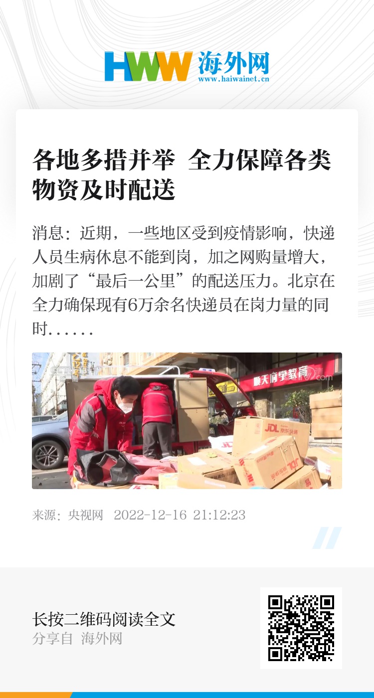 央视网消息:近期,一些地区受到疫情影响,快递人员生病休息不能到岗,加之网购量增大,加剧了“最后一公里”的配送压力。北京在全力确保现有6万余名快递员在岗力量的同时,协调各快递企业从全国调派力量驰援北京。吉林等地则通过调动社区网格员力量,解决“最后一公里”配送问题。