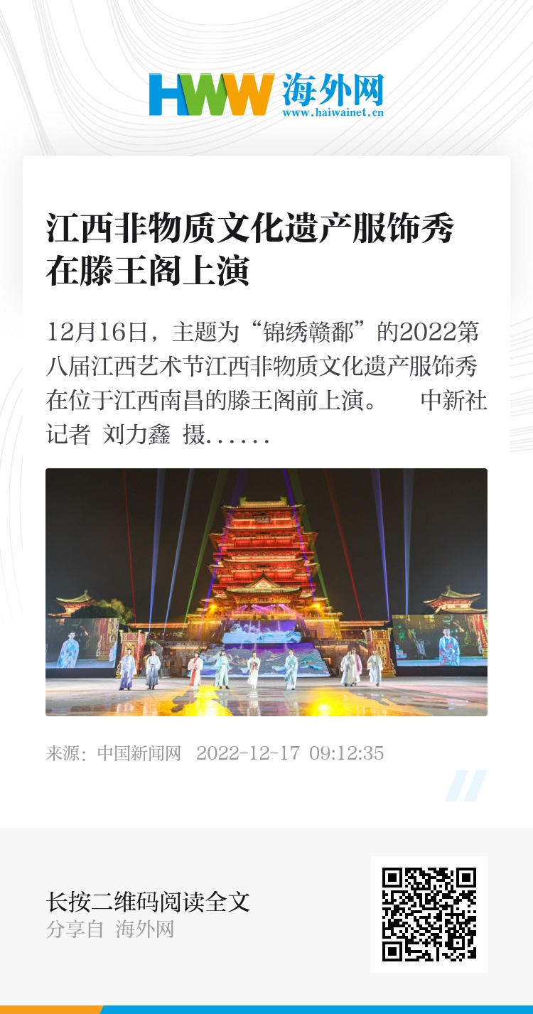 12月16日,主题为“锦绣赣鄱”的2022第八届江西艺术节江西非物质文化遗产服饰秀在位于江西南昌的滕王阁前上演。 中新社记者 刘力鑫 摄
