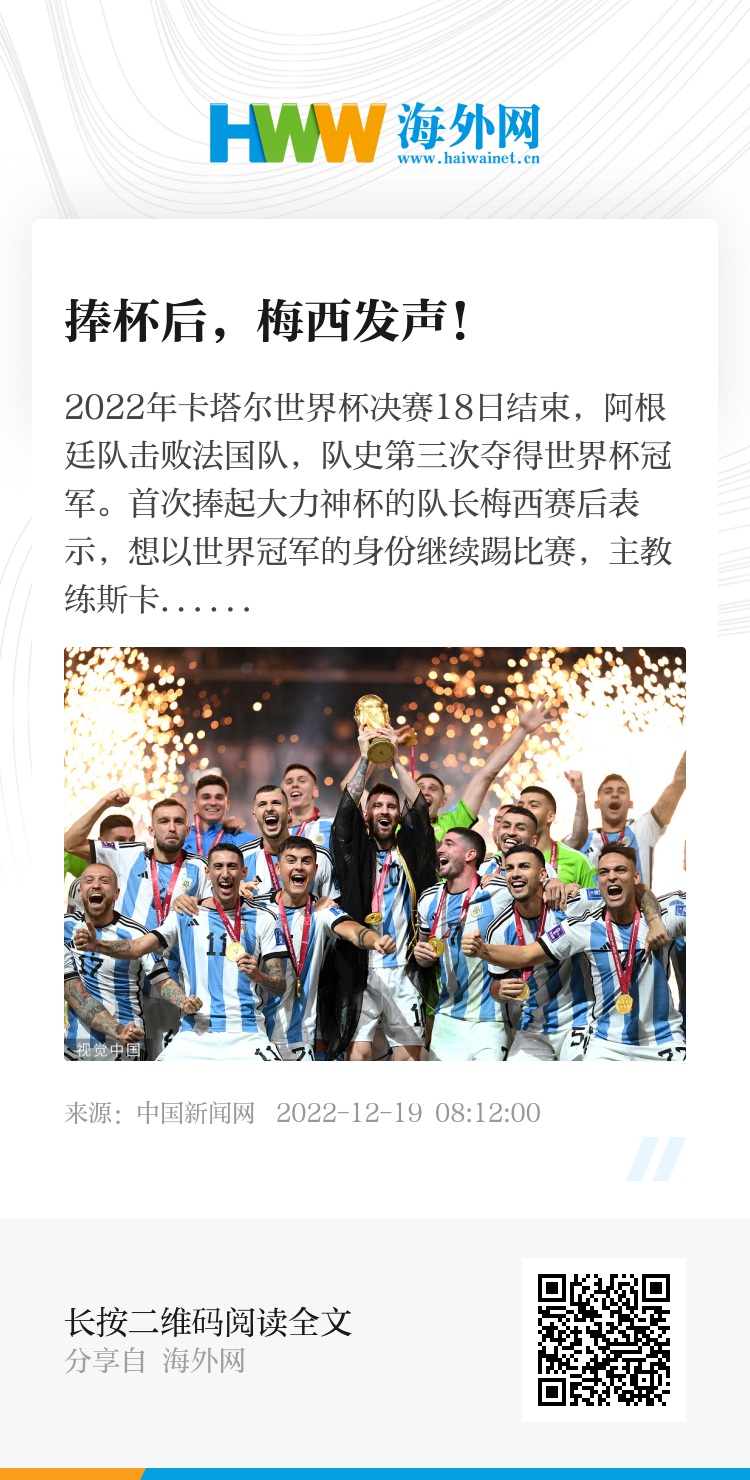 2022年卡塔尔世界杯决赛18日结束,阿根廷队击败法国队,队史第三次夺得世界杯冠军。首次捧起大力神杯的队长梅西赛后表示,想以世界冠军的身份继续踢比赛,主教练斯卡洛尼说,只要梅西愿意,国家队的10号球衣永远为他留着。