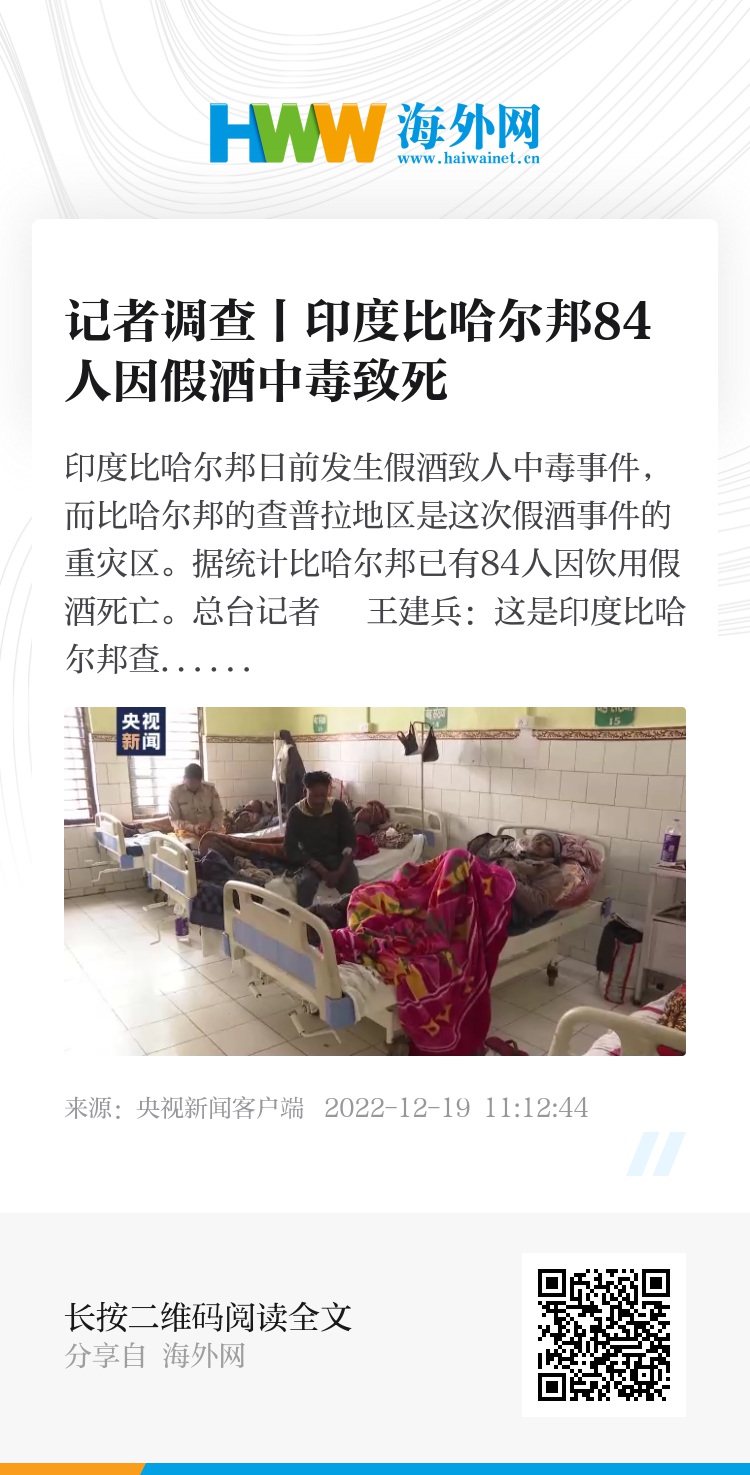 总台记者 王建兵:这是印度比哈尔邦查普拉地区的中心医院,从13日起陆续有人因为饮用假酒出现中毒症状并送医。截止18日,在这家医院因假酒死亡的病人已经达到34人。