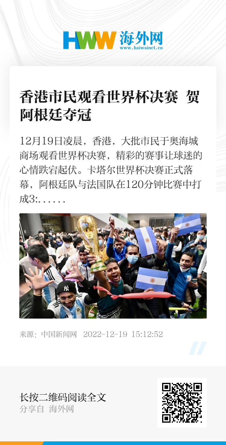 12月19日凌晨,香港,大批市民于奥海城商场观看世界杯决赛,精彩的赛事让球迷的心情跌宕起伏。卡塔尔世界杯决赛正式落幕,阿根廷队与法国队在120分钟比赛中打成3:3平分,最终阿根廷队于点球大战中以4:2胜法国夺得世界杯冠军。 中新社记者 李志华 摄