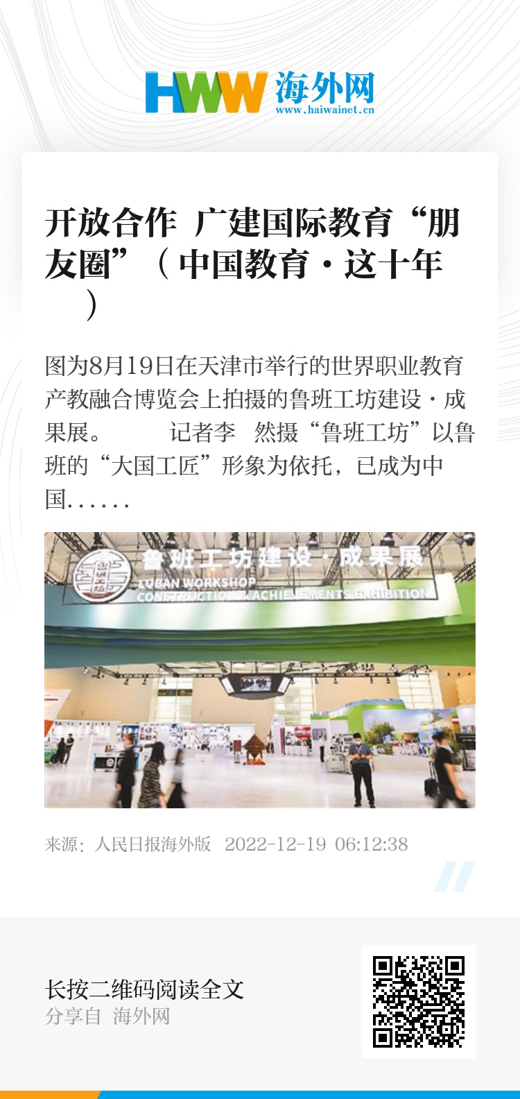 建设23个鲁班工坊,与159个国家和地区合作举办孔子学院(孔子课堂),成立“中国—东盟职业教育联合会”,启动“未来非洲—中非职业教育合作计划”……这一幕幕都见证着我国开放总体布局的优化,国际教育“朋友圈”不断扩大。