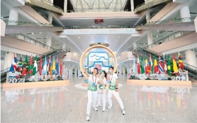 2021年7月31日,第44届世界遗产大会在福建省福州市闭幕。图为志愿者在大会主会场——福州海峡国际会展中心内留影。