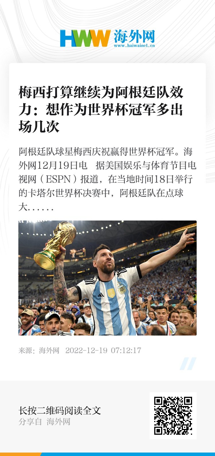 海外网12月19日电 据美国娱乐与体育节目电视网(ESPN)报道,在当地时间18日举行的卡塔尔世界杯决赛中,阿根廷队在点球大战中战胜法国队夺得冠军。赛后,阿根廷队球星梅西表示,他打算继续为阿根廷队效力一段时间,而球队主教练也对梅西的决定表示欢迎。
