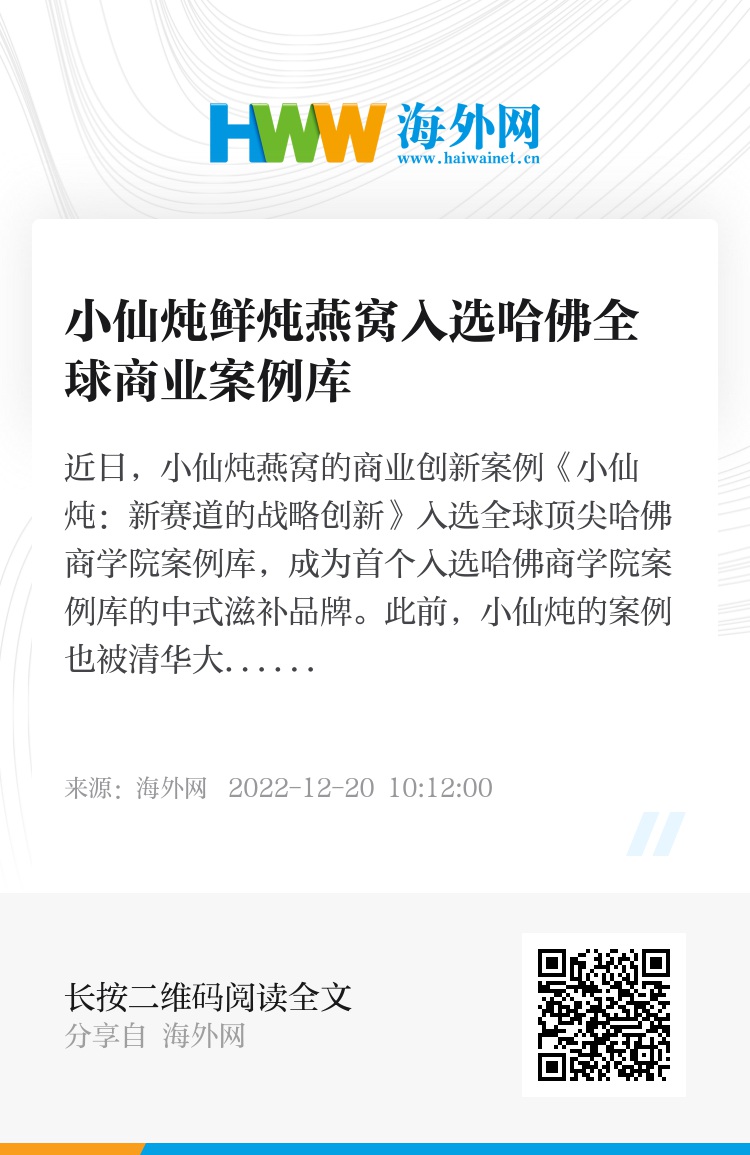 近日,小仙炖燕窝的商业创新案例《小仙炖:新赛道的战略创新》入选全球顶尖哈佛商学院案例库,成为首个入选哈佛商学院案例库的中式滋补品牌。此前,小仙炖的案例也被清华大学经济管理学院中国工商管理案例中心收录。接连入选核心权威案例库标志着小仙炖的创新商业实践获得国内外知名商学院的认可。作为中式滋补行业代表,小仙炖也进一步向更广阔的舞台共享自身的创新商业实践,向世界展现中国品牌的商业智慧。