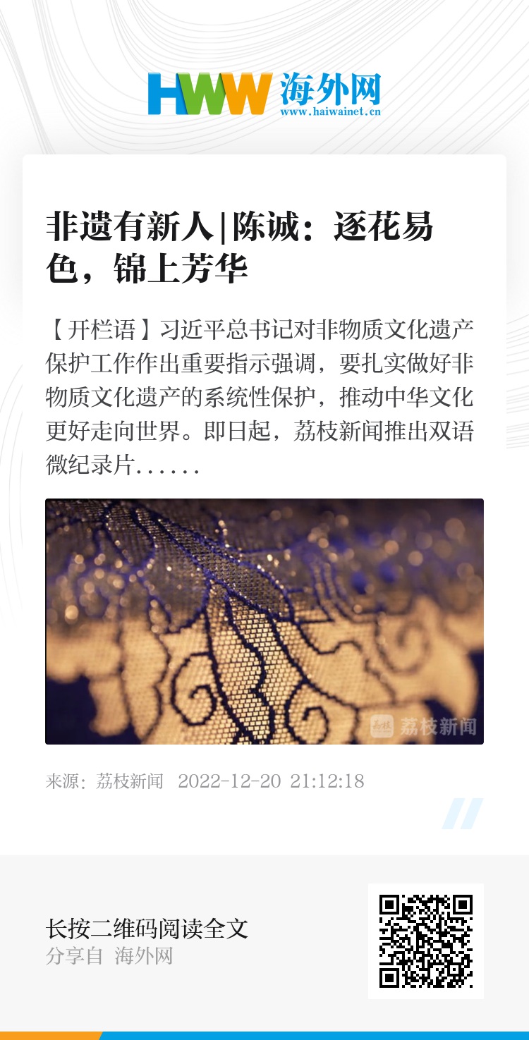 习近平总书记对非物质文化遗产保护工作作出重要指示强调,要扎实做好非物质文化遗产的系统性保护,推动中华文化更好走向世界。即日起,荔枝新闻推出双语微纪录片《非遗有新人》第二季,追寻千年文脉的足迹,讲述薪火相传的故事,感知国潮风起的澎湃,让非遗在新时代绽放新光彩、闪耀全世界。
