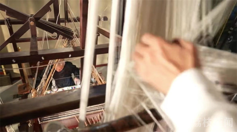 师父杨建顺让陈诚先从拽花工学起:先手脚并用爬上高达4米的大花楼织机,再反复提拉花本上的耳子线带动大纤,把花纹传到织口供下面织手挖花盘织。原理看似简单,但其实颇考验手速眼力,陈诚初学就遭遇了“眼会了,手却没跟上”的窘境。师父杨建顺看在眼里,适时为其指点迷津:“一抡、二掀、三抄、四会、五提、六捧、七拽、八掏、九撒”,在这套朗朗上口的拽花古法口诀的加持下,陈诚渐渐跟上了节奏。