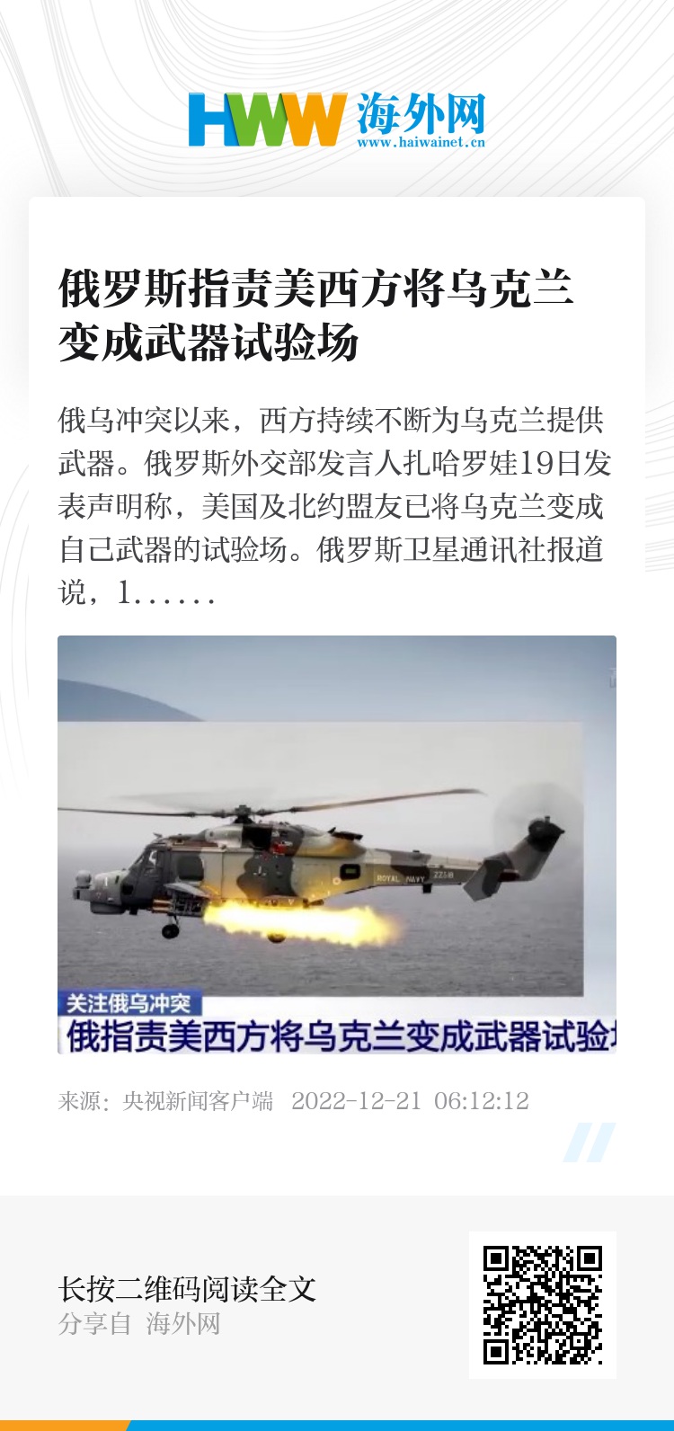 俄乌冲突以来,西方持续不断为乌克兰提供武器。俄罗斯外交部发言人扎哈罗娃19日发表声明称,美国及北约盟友已将乌克兰变成自己武器的试验场。