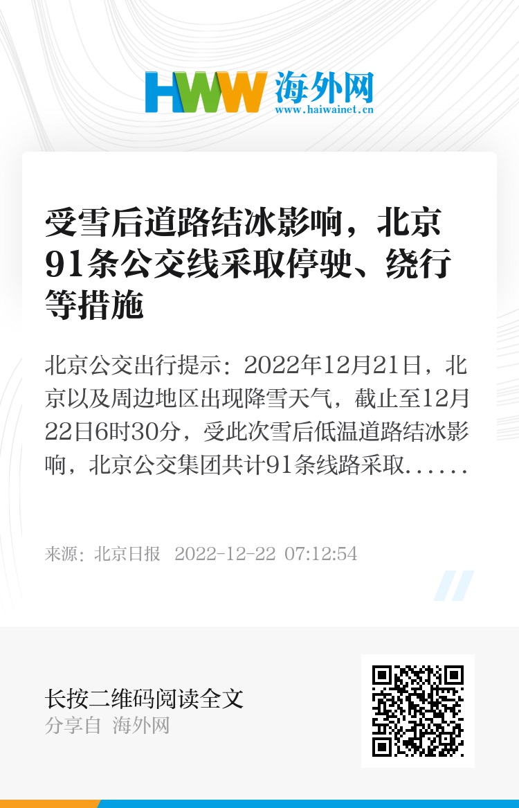 北京公交出行提示:2022年12月21日,北京以及周边地区出现降雪天气,截止至12月22日6时30分,受此次雪后低温道路结冰影响,北京公交集团共计91条线路采取临时措施,采取停驶措施85条,采取区间措施5条,采取绕行甩站措施1条。其中:市郊线路19条,采取停驶措施17条,采取区间措施1条,采取绕行甩站措施1条。山区线路72条,采取停驶措施68条,采取区间措施4条。具体线路及措施如下: