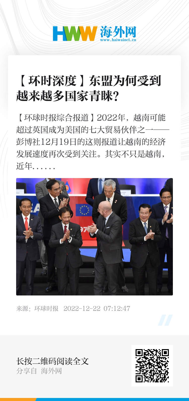 【环球时报综合报道】2022年,越南可能超过英国成为美国的七大贸易伙伴之一——彭博社12月19日的这则报道让越南的经济发展速度再次受到关注。其实不只是越南,近年来整个东盟的经济发展都令世界刮目相看。根据去年发布的《东盟发展展望》 报告,该组织有望在2030年成为世界第四大经济体。与不断增长的经济实力相得益彰的是,东盟越来越受到各方重视。12月14日,欧盟举行首届欧盟-东盟峰会。11月12日,美国和印度同一天将本国和东盟的关系升级为全面战略伙伴关系。韩国将东盟视为“印太”的核心地区,而日本则表示希望东京与东盟的关系“登上新台阶”。有专家对 《环球时报》记者表示,近年来东盟国际地位明显上升,这背后不仅有经济原因,还有地缘政治因素。