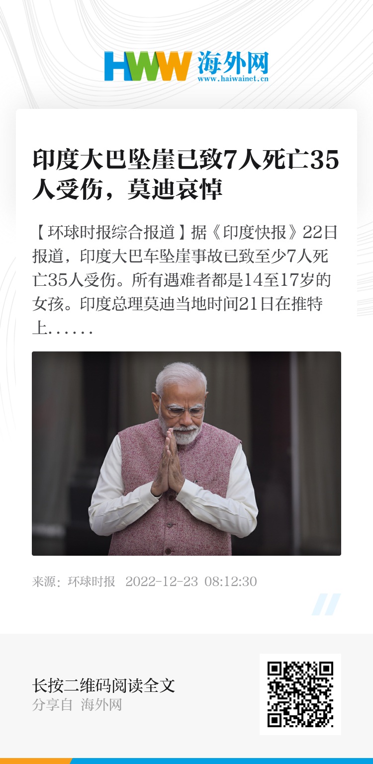 【环球时报综合报道】据《印度快报》22日报道,印度大巴车坠崖事故已致至少7人死亡35人受伤。所有遇难者都是14至17岁的女孩。印度总理莫迪当地时间21日在推特上发文对遇难者家属表示慰问。