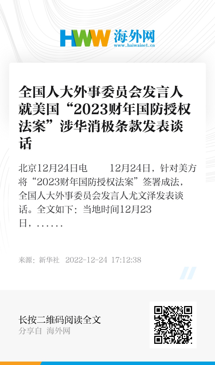 新华社北京12月24日电 12月24日,针对美方将“2023财年国防授权法案”签署成法,全国人大外事委员会发言人尤文泽发表谈话。全文如下: