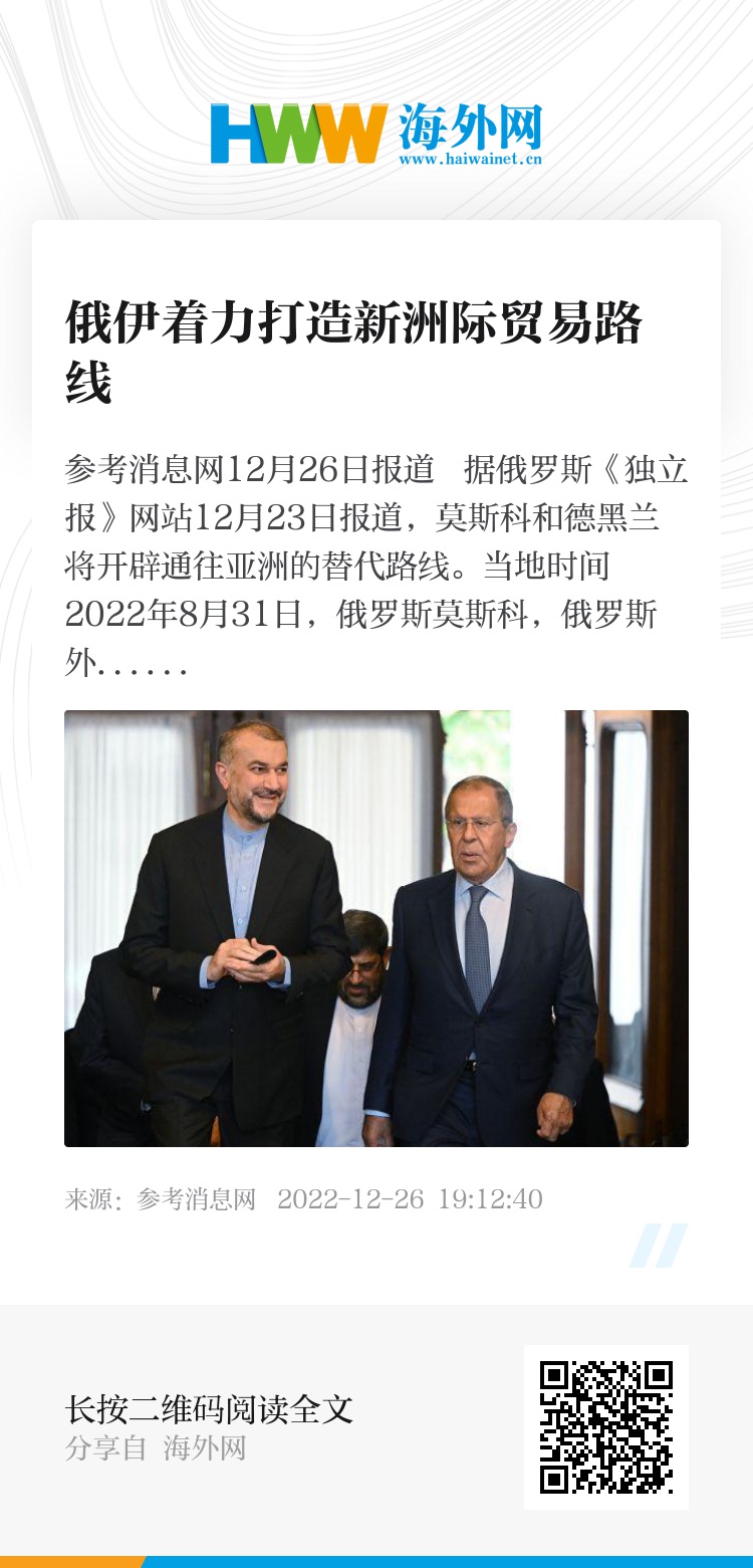 参考消息网12月26日报道 据俄罗斯《独立报》网站12月23日报道,莫斯科和德黑兰将开辟通往亚洲的替代路线。